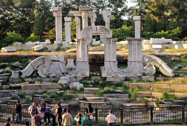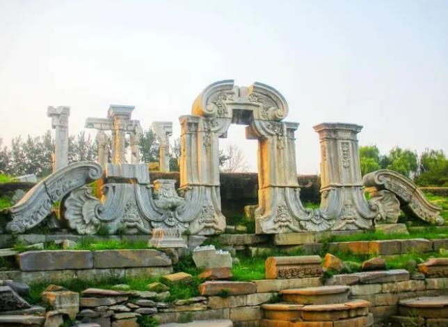 圆明园遗址公园是一个著名的爱国主义教育基地,建于1988年,目前仅保留了山形水系、园林布局和建筑底座,但仍可见到假山和雕刻的残迹。